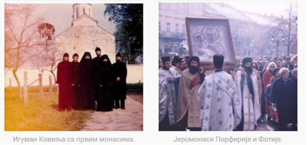 Igumen Porfýrij v monastieri Kovilj s prvými mníchmi (vľavo) a s jeromníchom Fótiom (vpravo).
