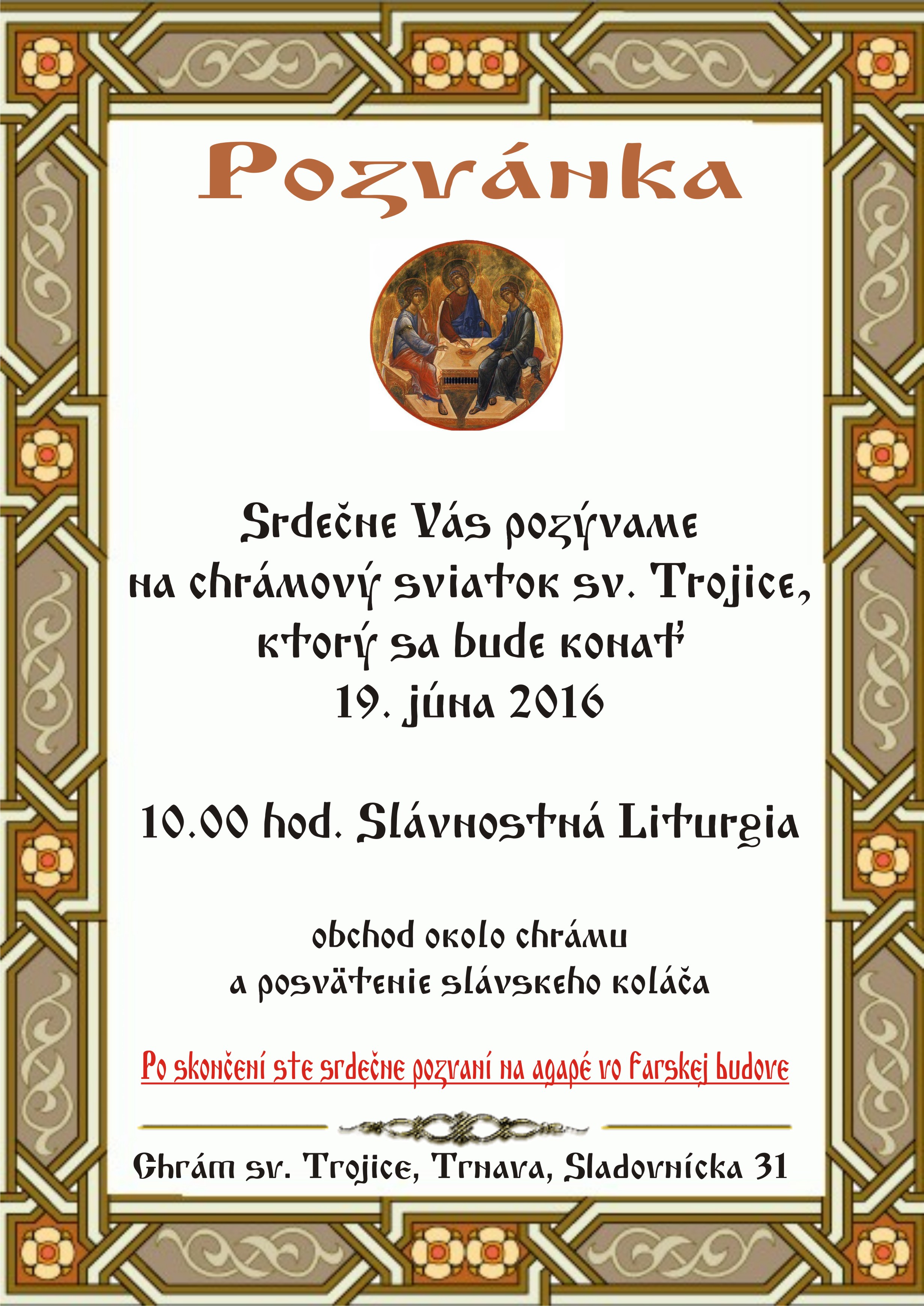 Pravoslávna cirkevná obec Trnava vás 19. júna 2016 pozýva na chrámový sviatok Svätej Trojice. Slávnostná svätá liturgia sa bude konať o 10:00 hodine ráno a po jej ukončení bude obchod okolo chrámu. Na záver bude posvätenie slávskeho koláča.